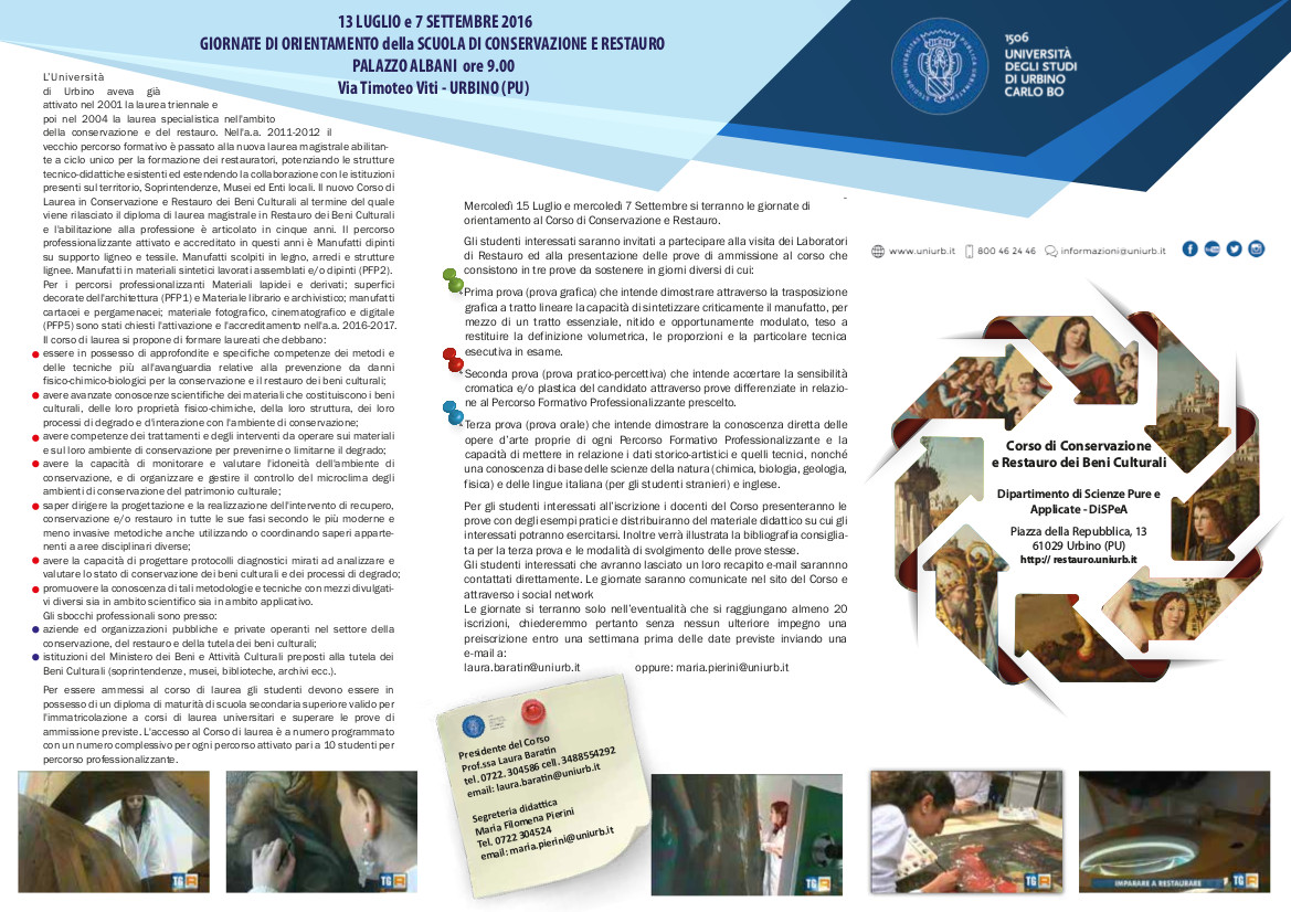 Il 13 Luglio ed il 7 Settembre si terranno le GIORNATE DI ORIENTAMENTO al Corso di Conservazione e Restauro. Gli studenti saranno invitati a partecipare alla visita dei Laboratori di restauro ed alla presentazione delle prove di ammissione al corso.